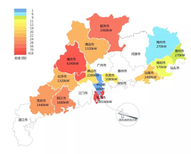 2018年,在港珠澳大桥充电桩项目中,云联商城在港珠澳大桥珠海端口岸人工岛搭建的充电管理平台及电能量采集终端,为大桥的绿色运营和电力保障提供技术支持。除此之外,仅广东省内,云联商城充电桩涵盖肇庆、珠海等14个城市,具体分布情况如下图所示。